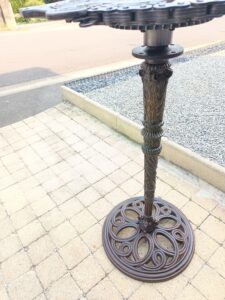 fabriqué avec des pièces de récupération, métal, pied de parasol, outils chaines,  ….