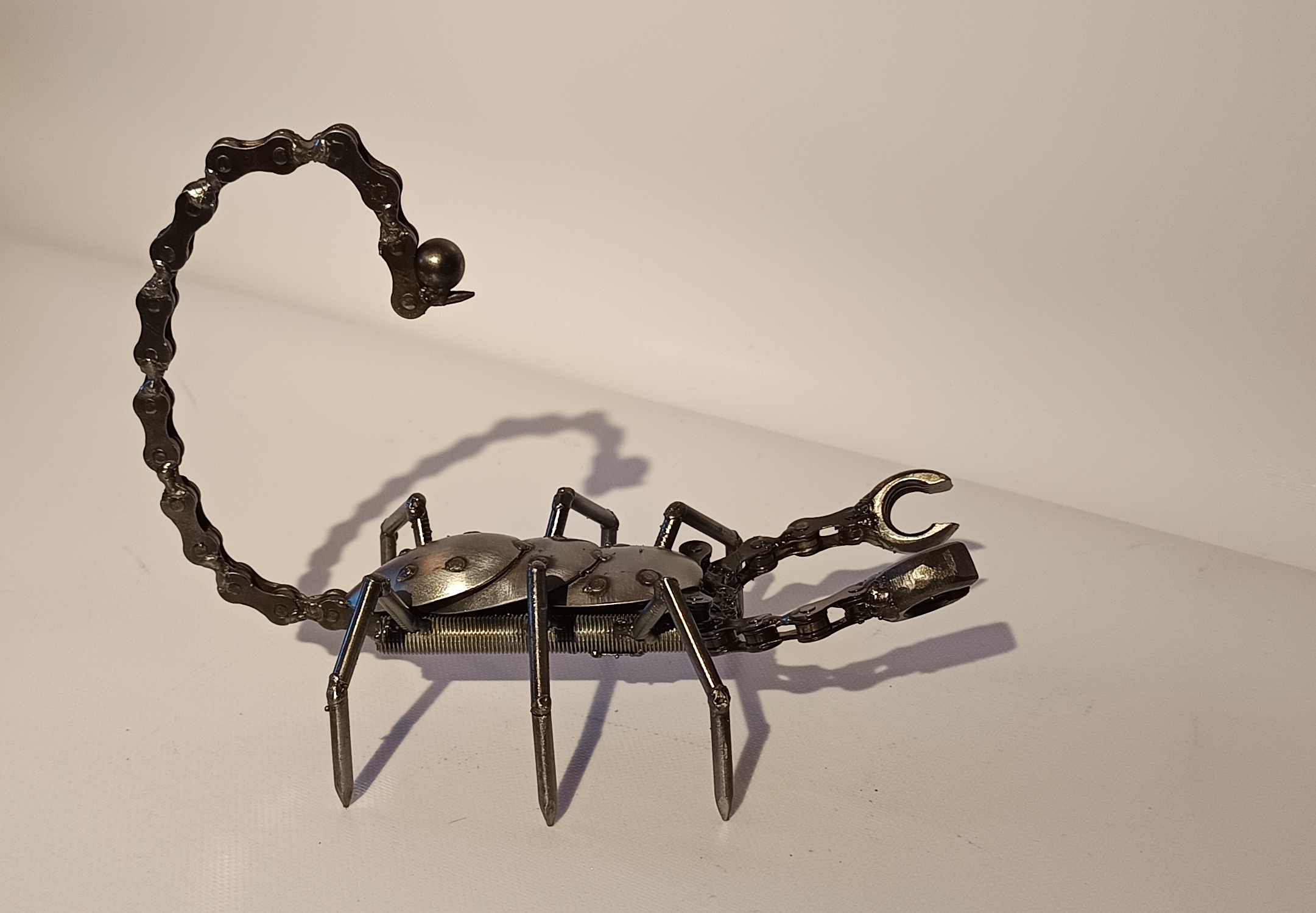 fabriqué avec des pièces de récupération, métal, petites cuillères, chaines de vélos,  ….