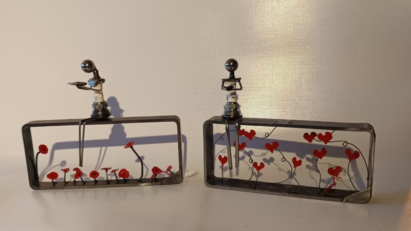 fabriqué avec des pièces de récupération, métal, bougie de voiture, tube carré ….